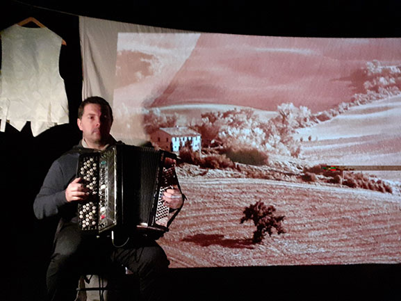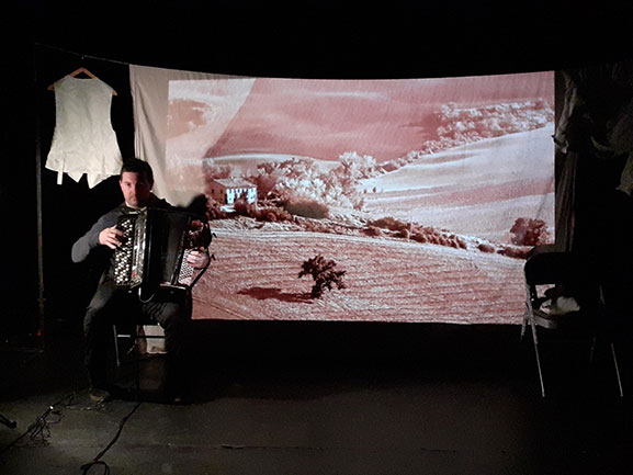 Sur scène , une installation minimaliste offre un écrin aux voix des personnages et de la narratrice ainsi qu’aux sons, chants et musiques de l’époque (1910-1914), le tout sur fond d’images d’archives et de paysages, comme une perspective où projeter le regard, la fenêtre d’un passé où doucement nous glisser…