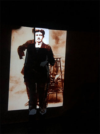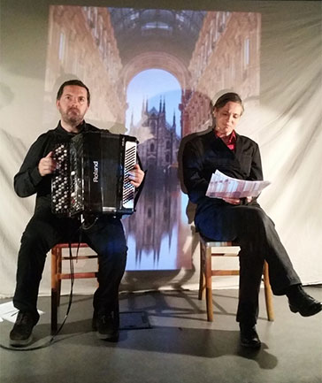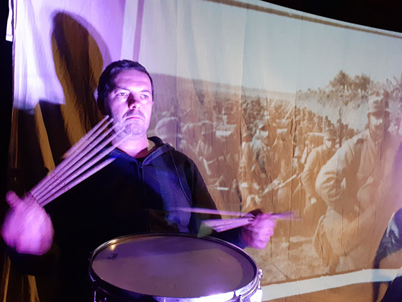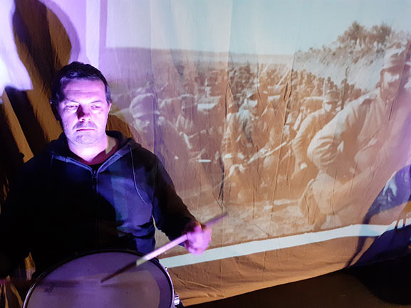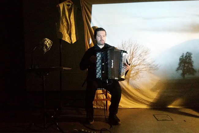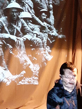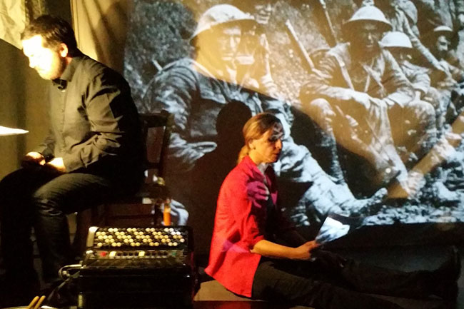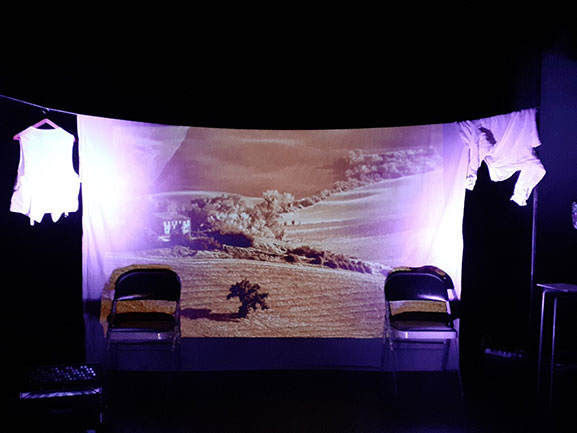 Sur scène , une installation minimaliste offre un écrin aux voix des personnages et de la narratrice ainsi qu’aux sons, chants et musiques de l’époque (1910-1914), le tout sur fond d’images d’archives et de paysages, comme une perspective où projeter le regard, la fenêtre d’un passé où doucement nous glisser…