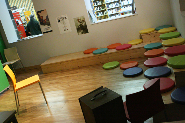 Chaque lieu invitant la lecture est utilisé dans sa spécificité et selon les envies des accueillants, pour y déambuler, surgir des rayons, explorer l'espace de façon décalée, ou s'y lover dans un petit coin tranquille. Une lampe et une caisse en bois suffisent à apporter la magie...