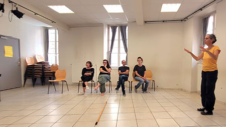 Sophie propose des mise en jeu -en groupes ou par deux- pour se sentir plus à l'aise et libre dans son corps, se familiariser avec l'espace et l'autre, découvrir sa voix pour prendre la parole plus facilement devant les autres.